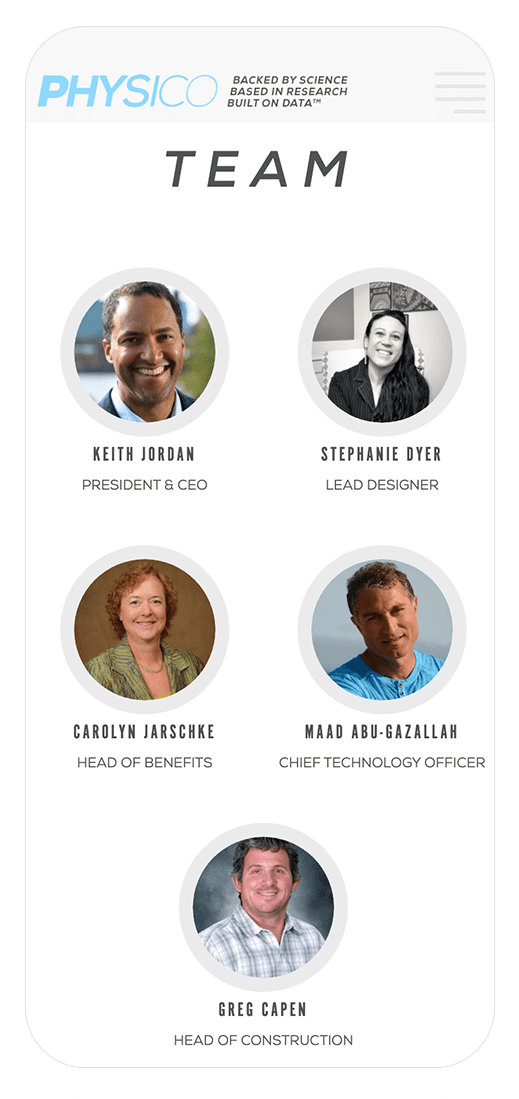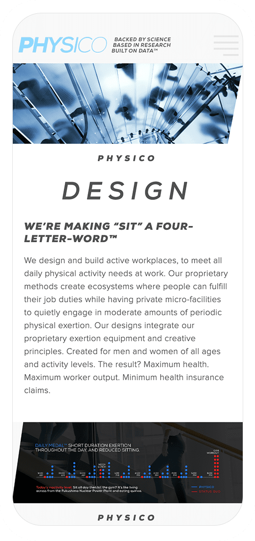 Physico designs and builds active workplaces, to meet all daily physical activity needs at work. Their proprietary methods create ecosystems where people can fulfill their job duties while having private micro-facilities to quietly engage in moderate amounts of periodic physical exertion.